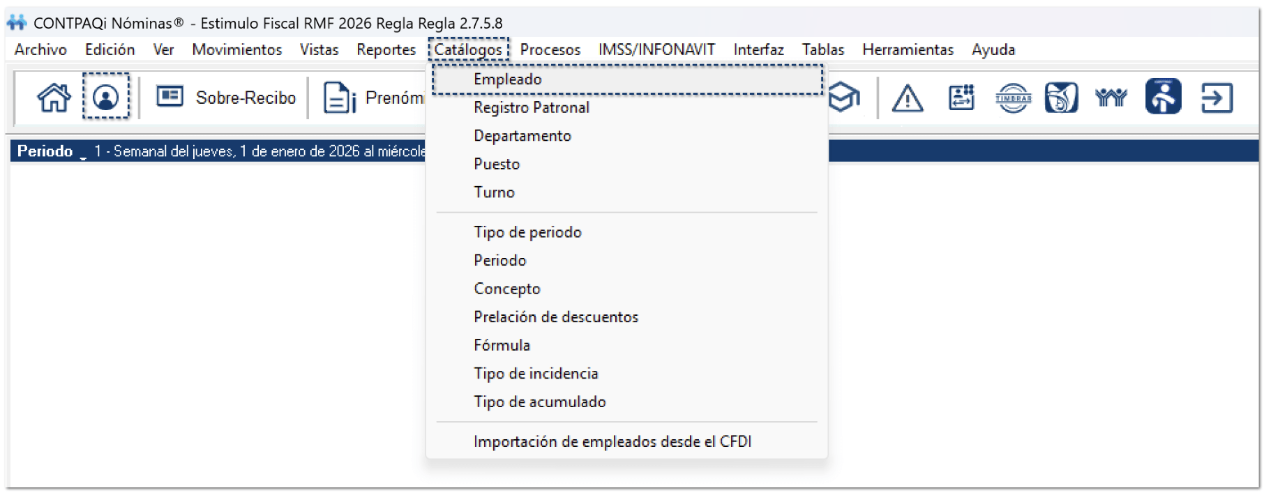 1.Ingresa al catálogo Empleados, desde el menú Catálogos o desde el acceso directo en la barra de herramientas.