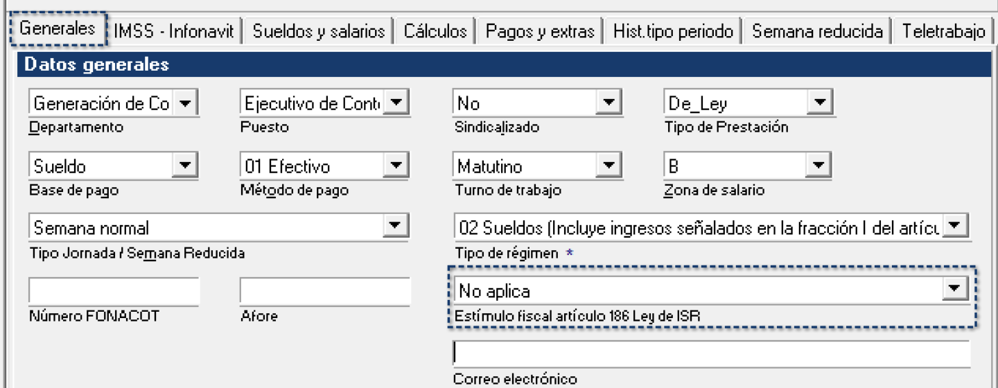 2.Selecciona al empleado al que se le aplicará el estímulo fiscal. Dirígete a la pestaña General, donde se concentran los datos principales del empleado.