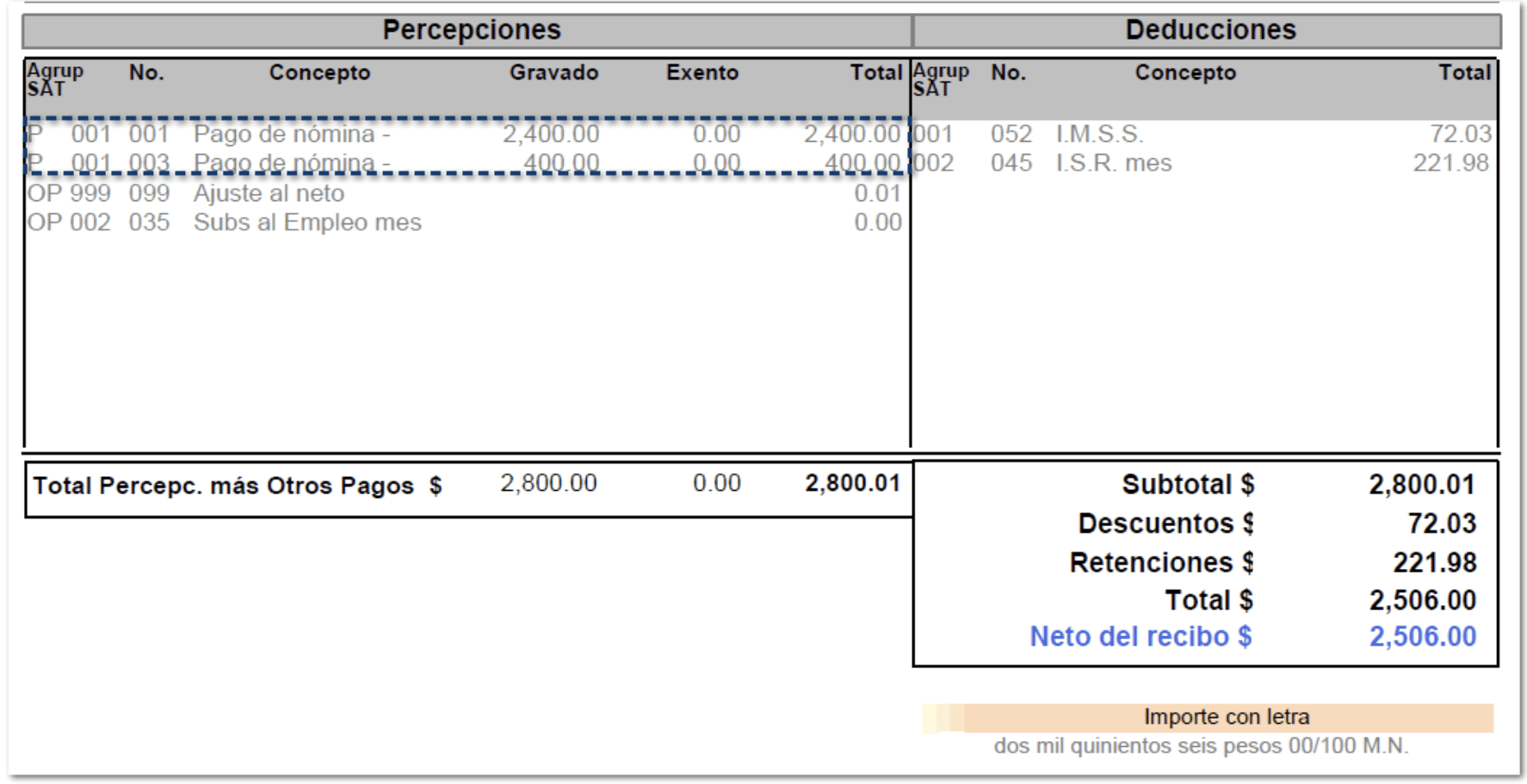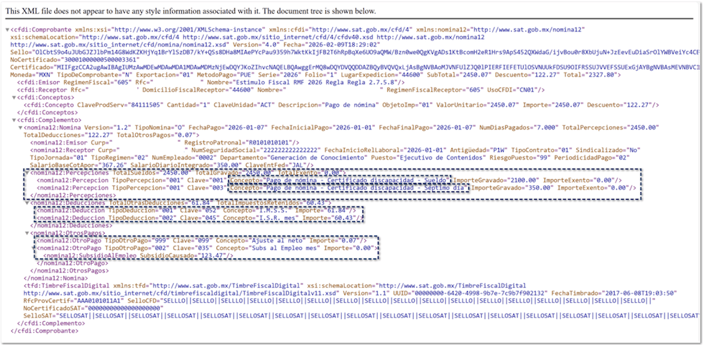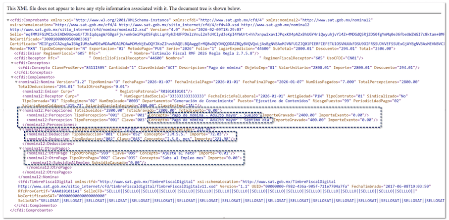 Cuando aplica, el comprobante agrega de forma automática la leyenda correspondiente en cada percepción: “Pago de nómina – Adulto mayor” o “Pago de nómina – Certificado discapacidad”.
