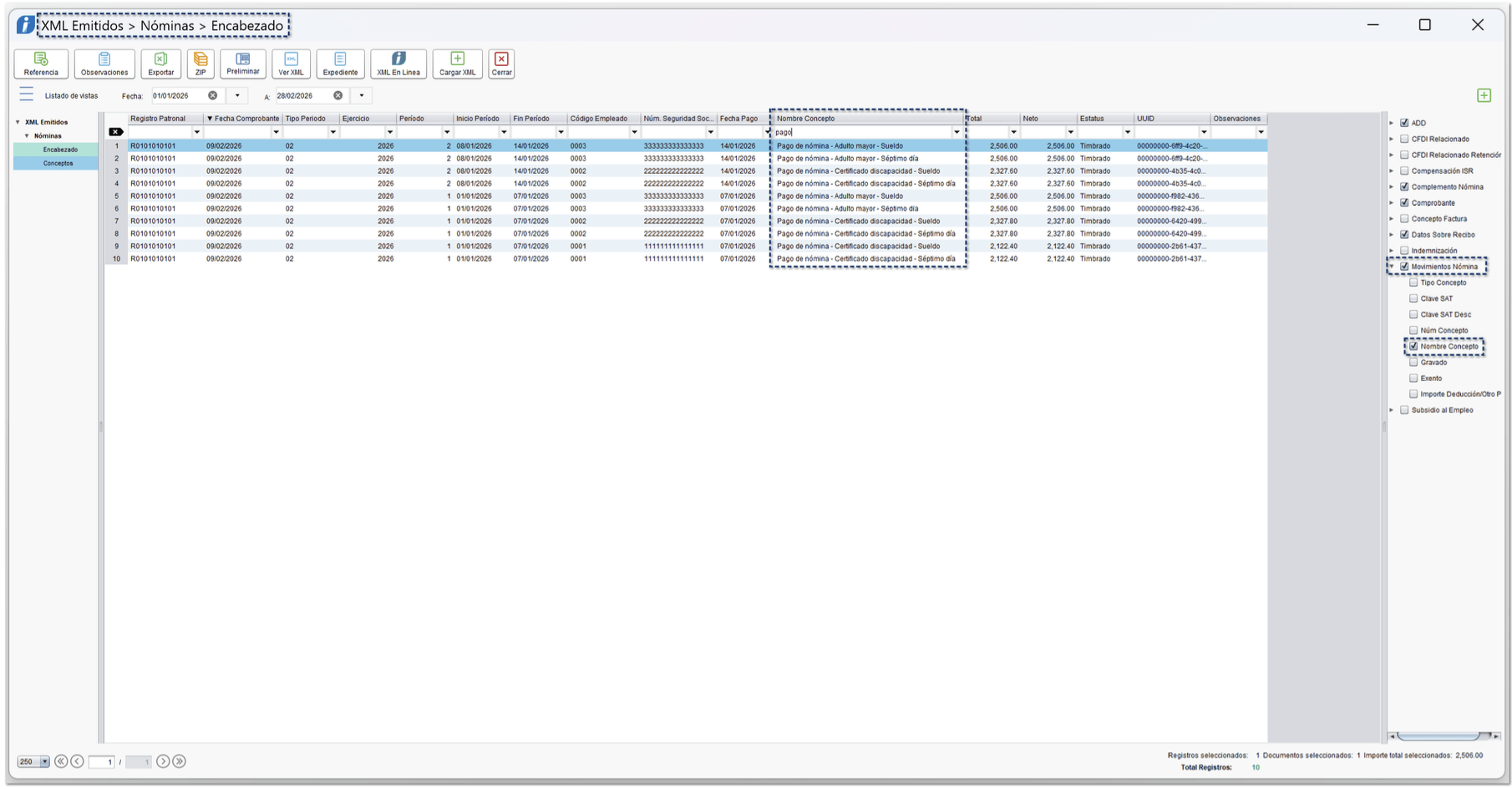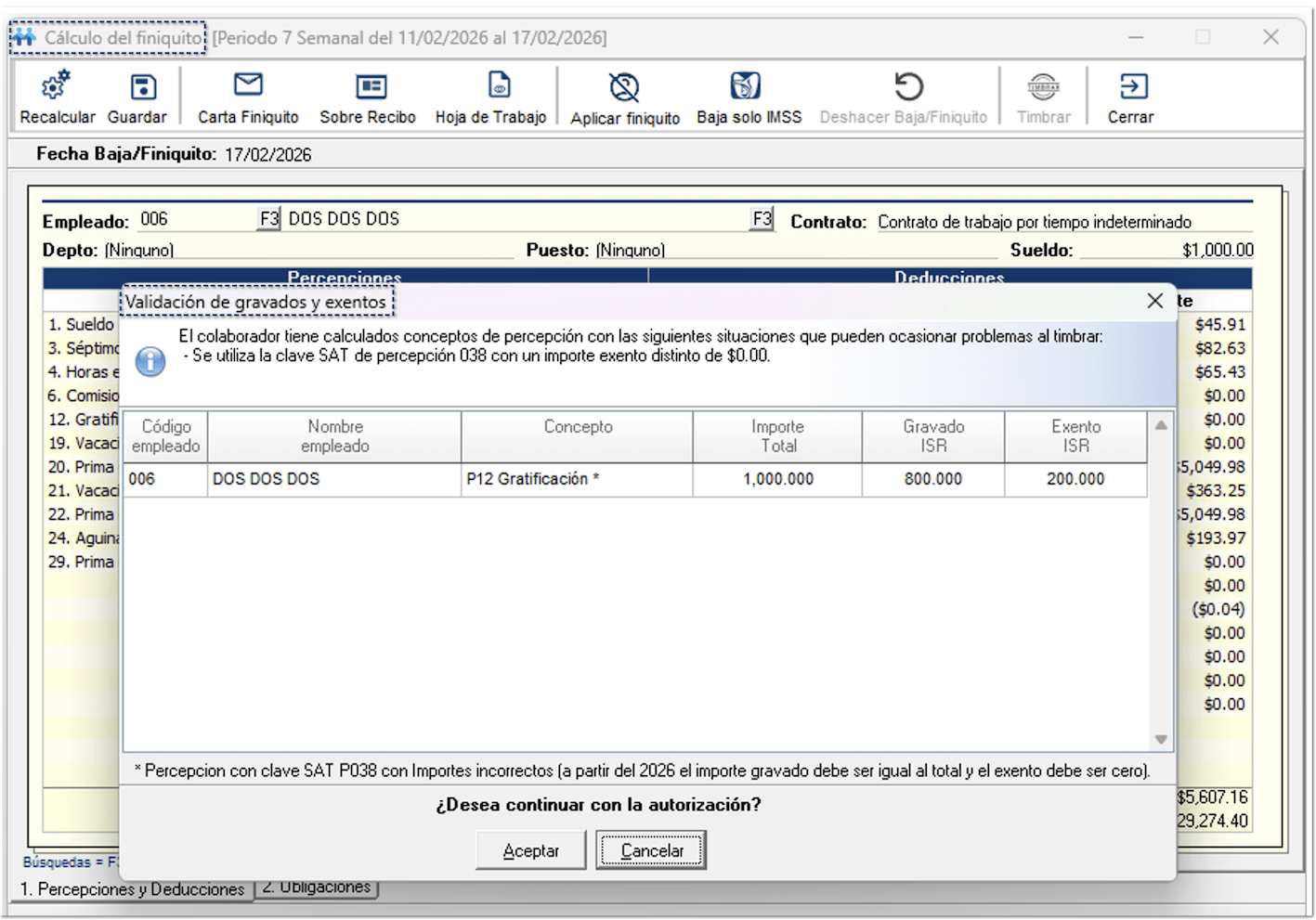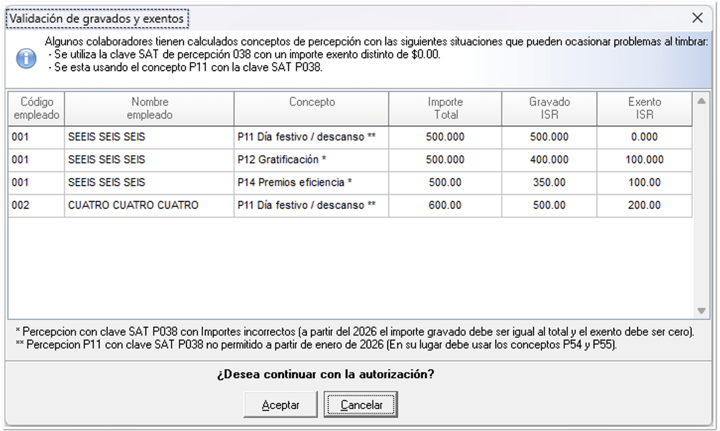 Se incluye un aviso informativo para el usuario cuando, durante la ejecución de ciertos procesos de nómina, se detectan conceptos con clave SAT 038 configurados como exentos.