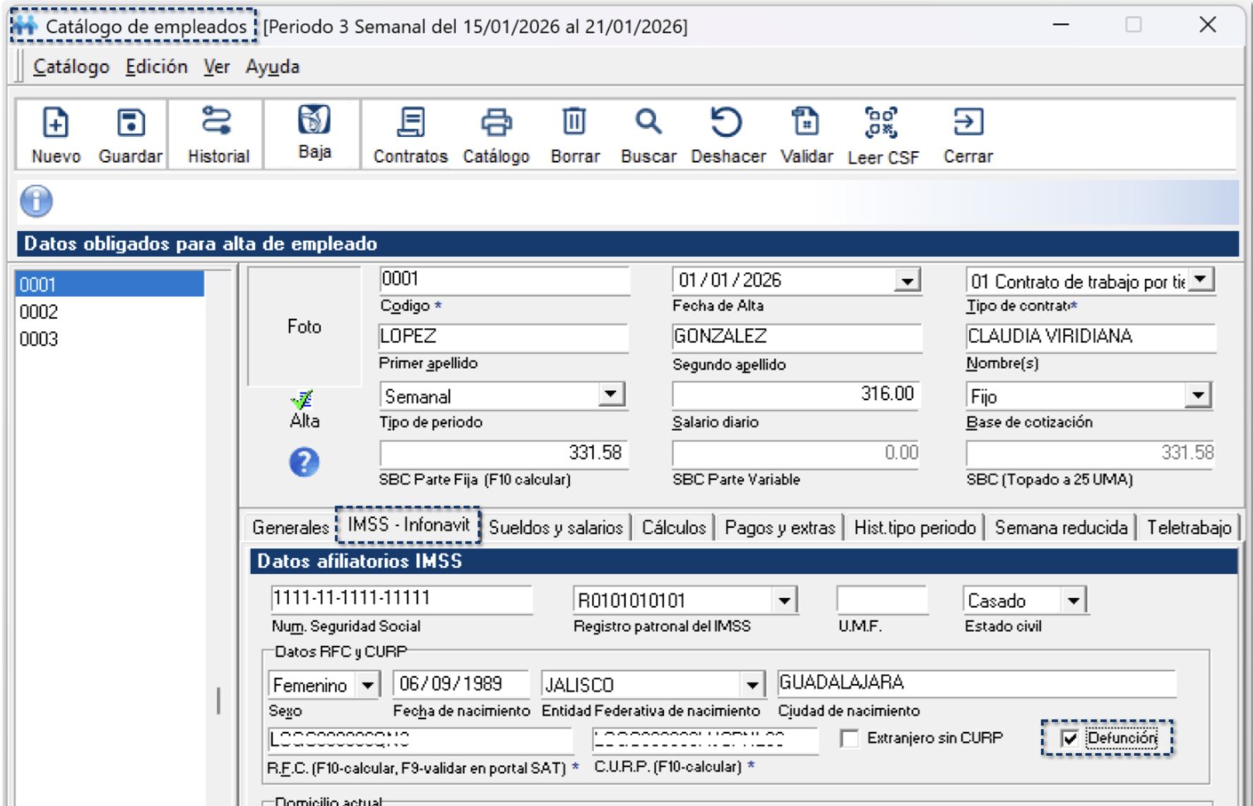 2.Selecciona al empleado que marcarás como fallecido. Dirígete a la pestaña IMSS – Infonavit, y habilita la opción Defunción.