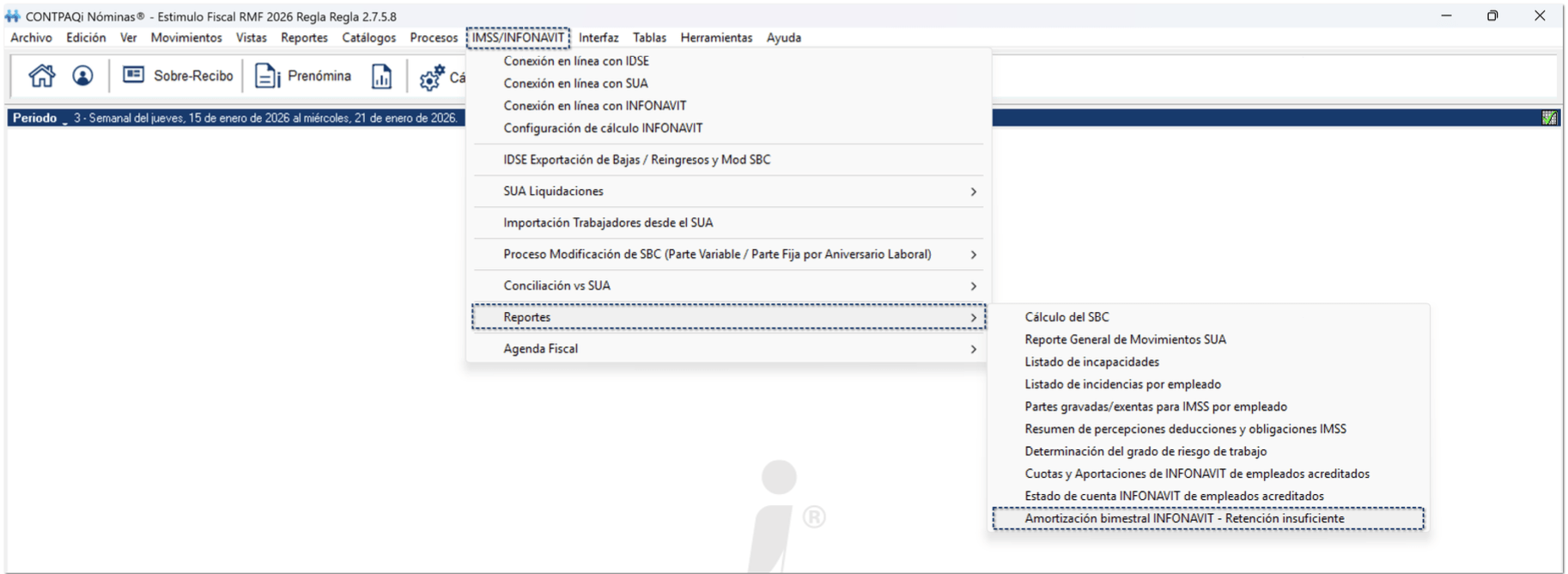 Al ingresar al menú IMSS/INFONAVIT, seleccionar el submenú Reportes y ejecutar el reporte Amortización bimestral INFONAVIT – Retención insuficiente.