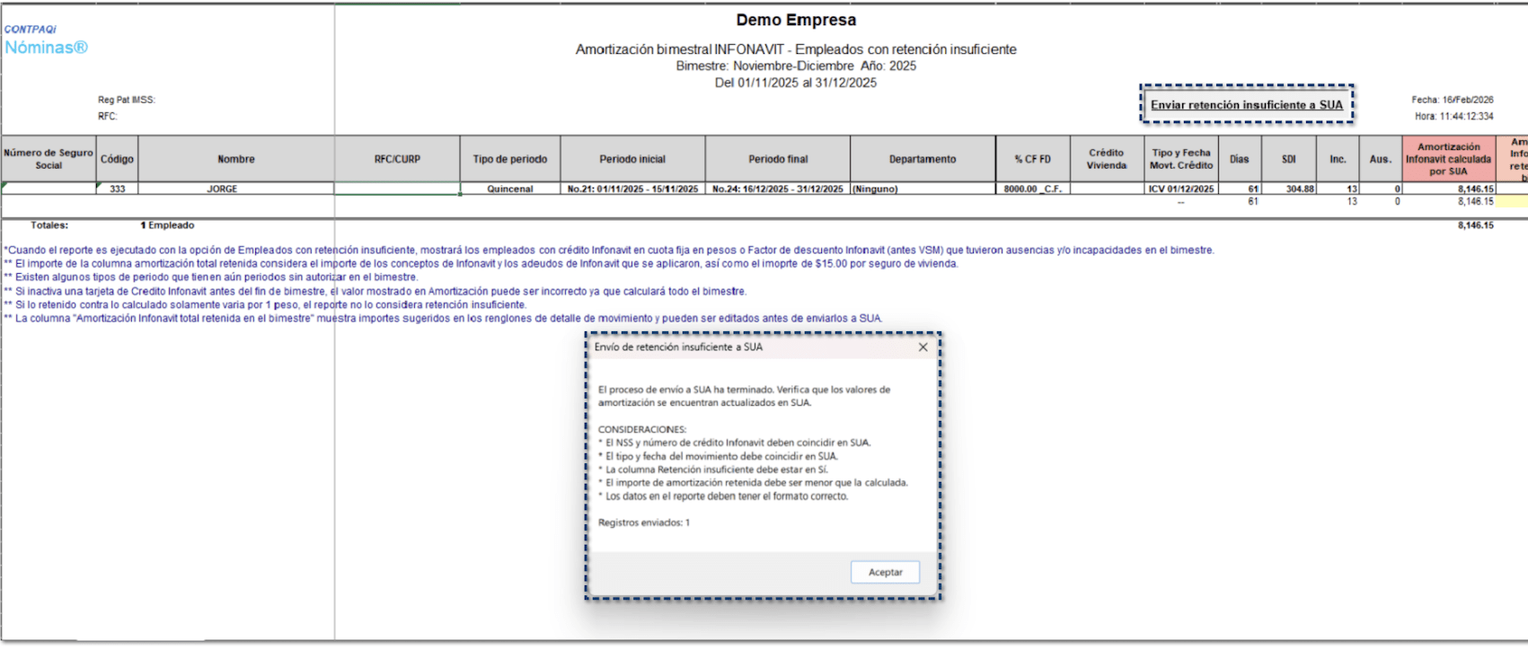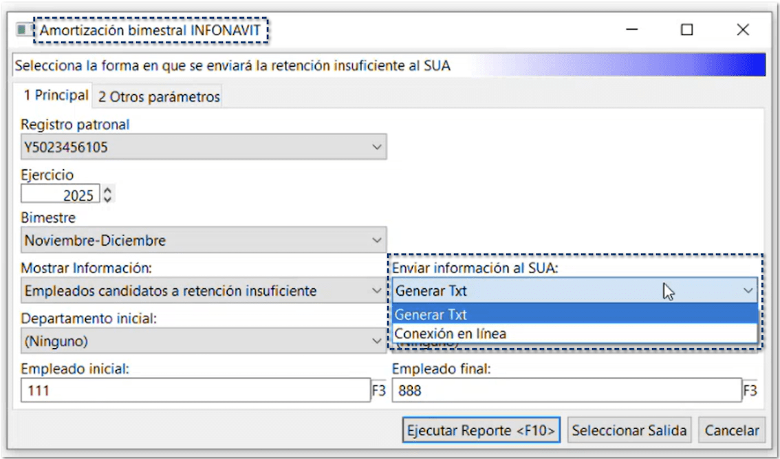 A partir de esta versión, el sistema optimiza el manejo de retenciones insuficientes al permitir enviar múltiples importes de forma masiva al SUA, directamente desde el reporte Amortización bimestral INFONAVIT – Retención insuficiente, eliminando la necesidad de realizar el proceso de manera individual por cada empleado y subperiodo.